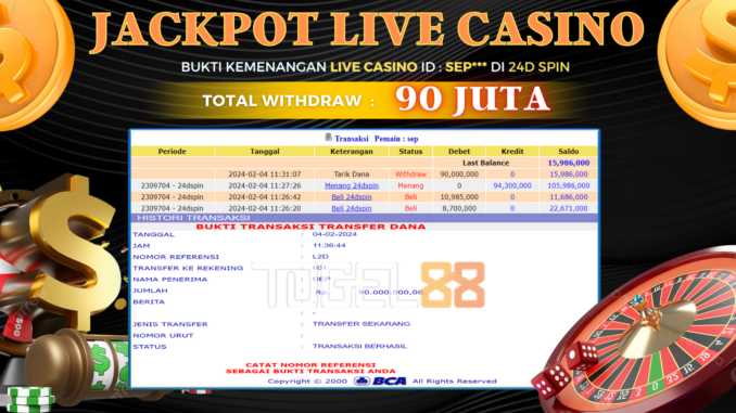 MEMBER TOGEL88 MENERIMA PELUNASAN JACKPOT LIVE GAME DI 24D SPIN Rp 90.000.000,- LUNAS