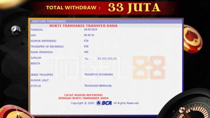 TOGEL88 mengucapkan selamat kepada user id : ARI*** yang telah berhasil mendapatkan jackpot pada permainan LIVE CASINO DI SICBO DICE. Kemenangan sebesar Rp 33.000.000,-. telah dibayarkan LUNAS oleh pihak TOGEL88 kepada pemilik user id setelah yang bersangkutan mengisi formulir withdraw. Proses pencairan dana berlangsung sangat cepat hanya dalam waktu 5-10 menit sudah berada dalam rekening pemilik user id. Bukti transfer yang dapat anda lihat adalah bukti SAH / VALID yang langsung di dapatkan melalui bukti transaksi dari Bank yang digunakan untuk pengiriman dana pada rekening pemilik user id. Terima kasih kami sampaikan kepada para pengguna setia TOGEL88 yang telah menggunakan situs kami, sebagai Bandar Terpercaya yang pastinya membayar semua kemenangan member hingga lunas. Apakah TOGEL88 PENIPU ? Reputasi “TOGEL88 TERPERCAYA” sudah sangat melekat. puluhan hingga ratusan ribu pengguna setia TOGEL88 tetap menggunakan situs terbesar dan terbaik di Indonesia ini. Hapus rasa was-was dan khawatir anda, kemenangan anda berapapun PASTI dibayarkan hingga lunas.