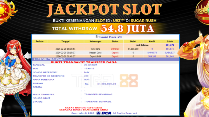 TOGEL88 mengucapkan selamat kepada user id : U93*** yang telah berhasil mendapatkan jackpot pada permainan SLOT DI SUGAR RUSH. Kemenangan sebesar Rp 54.800.000,-. telah dibayarkan LUNAS oleh pihak TOGEL88 kepada pemilik user id setelah yang bersangkutan mengisi formulir withdraw. Proses pencairan dana berlangsung sangat cepat hanya dalam waktu 5-10 menit sudah berada dalam rekening pemilik user id. Bukti transfer yang dapat anda lihat adalah bukti SAH / VALID yang langsung di dapatkan melalui bukti transaksi dari Bank yang digunakan untuk pengiriman dana pada rekening pemilik user id. Terima kasih kami sampaikan kepada para pengguna setia TOGEL88 yang telah menggunakan situs kami, sebagai Bandar Terpercaya yang pastinya membayar semua kemenangan member hingga lunas. Apakah TOGEL88 PENIPU ? Reputasi “TOGEL88 TERPERCAYA” sudah sangat melekat. puluhan hingga ratusan ribu pengguna setia TOGEL88 tetap menggunakan situs terbesar dan terbaik di Indonesia ini. Hapus rasa was-was dan khawatir anda, kemenangan anda berapapun PASTI dibayarkan hingga lunas.