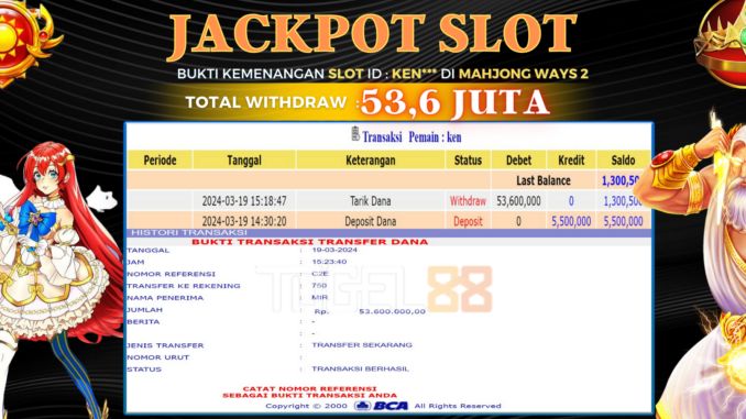 TOGEL88 mengucapkan selamat kepada user id : KEN*** yang telah berhasil mendapatkan jackpot pada permainan SLOT DI MAHJONG WAYS 2. Kemenangan sebesar Rp 53.600.000,-. telah dibayarkan LUNAS oleh pihak TOGEL88 kepada pemilik user id setelah yang bersangkutan mengisi formulir withdraw. Proses pencairan dana berlangsung sangat cepat hanya dalam waktu 5-10 menit sudah berada dalam rekening pemilik user id. Bukti transfer yang dapat anda lihat adalah bukti SAH / VALID yang langsung di dapatkan melalui bukti transaksi dari Bank yang digunakan untuk pengiriman dana pada rekening pemilik user id. Terima kasih kami sampaikan kepada para pengguna setia TOGEL88 yang telah menggunakan situs kami, sebagai Bandar Terpercaya yang pastinya membayar semua kemenangan member hingga lunas. Apakah TOGEL88 PENIPU ? Reputasi “TOGEL88 TERPERCAYA” sudah sangat melekat. puluhan hingga ratusan ribu pengguna setia TOGEL88 tetap menggunakan situs terbesar dan terbaik di Indonesia ini. Hapus rasa was-was dan khawatir anda, kemenangan anda berapapun PASTI dibayarkan hingga lunas.
