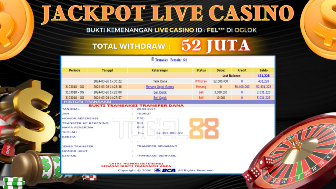 TOGEL88 JACKPOT LIVE CASINO DI OGLOK Rp 52.000.000,- LUNAS