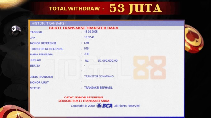 TOGEL88 mengucapkan selamat kepada user id : NAM*** yang telah berhasil mendapatkan jackpot pada permainan SLOT DI MAHJONG WAYS. Kemenangan sebesar Rp 53.000.000,-. telah dibayarkan LUNAS oleh pihak TOGEL88 kepada pemilik user id setelah yang bersangkutan mengisi formulir withdraw. Proses pencairan dana berlangsung sangat cepat hanya dalam waktu 5-10 menit sudah berada dalam rekening pemilik user id. Bukti transfer yang dapat anda lihat adalah bukti SAH / VALID yang langsung di dapatkan melalui bukti transaksi dari Bank yang digunakan untuk pengiriman dana pada rekening pemilik user id. Terima kasih kami sampaikan kepada para pengguna setia TOGEL88 yang telah menggunakan situs kami, sebagai Bandar Terpercaya yang pastinya membayar semua kemenangan member hingga lunas. Apakah TOGEL88 PENIPU ? Reputasi “TOGEL88 TERPERCAYA” sudah sangat melekat. puluhan hingga ratusan ribu pengguna setia TOGEL88 tetap menggunakan situs terbesar dan terbaik di Indonesia ini. Hapus rasa was-was dan khawatir anda, kemenangan anda berapapun PASTI dibayarkan hingga lunas.