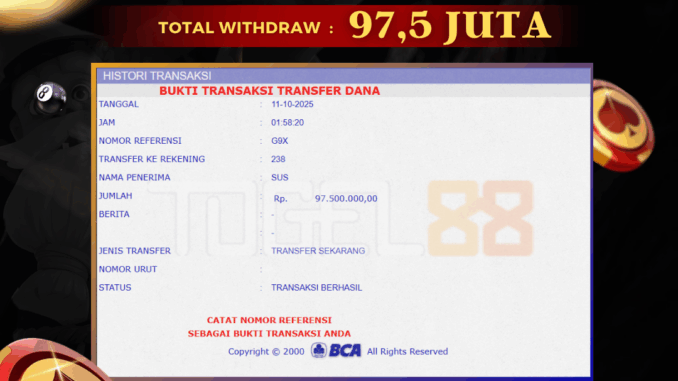 TOGEL88 mengucapkan selamat kepada user id : OPA*** yang telah berhasil mendapatkan jackpot pada permainan LIVE CASINO DI SUWIT. Kemenangan sebesar Rp 97.500.000,-. telah dibayarkan LUNAS oleh pihak TOGEL88 kepada pemilik user id setelah yang bersangkutan mengisi formulir withdraw. Proses pencairan dana berlangsung sangat cepat hanya dalam waktu 5-10 menit sudah berada dalam rekening pemilik user id. Bukti transfer yang dapat anda lihat adalah bukti SAH / VALID yang langsung di dapatkan melalui bukti transaksi dari Bank yang digunakan untuk pengiriman dana pada rekening pemilik user id. Terima kasih kami sampaikan kepada para pengguna setia TOGEL88 yang telah menggunakan situs kami, sebagai Bandar Terpercaya yang pastinya membayar semua kemenangan member hingga lunas. Apakah TOGEL88 PENIPU ? Reputasi “TOGEL88 TERPERCAYA” sudah sangat melekat. puluhan hingga ratusan ribu pengguna setia TOGEL88 tetap menggunakan situs terbesar dan terbaik di Indonesia ini. Hapus rasa was-was dan khawatir anda, kemenangan anda berapapun PASTI dibayarkan hingga lunas.