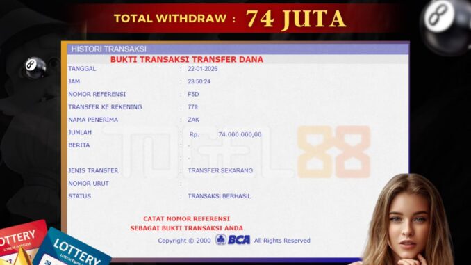 TOGEL88 mengucapkan selamat kepada user id : XAK*** yang telah berhasil mendapatkan jackpot pada permainan JACKPOT TOGEL DI JAKARTA 4D. Kemenangan sebesar Rp 74.000.000,-. telah dibayarkan LUNAS oleh pihak TOGEL88 kepada pemilik user id setelah yang bersangkutan mengisi formulir withdraw. Proses pencairan dana berlangsung sangat cepat hanya dalam waktu 5-10 menit sudah berada dalam rekening pemilik user id. Bukti transfer yang dapat anda lihat adalah bukti SAH / VALID yang langsung di dapatkan melalui bukti transaksi dari Bank yang digunakan untuk pengiriman dana pada rekening pemilik user id. Terima kasih kami sampaikan kepada para pengguna setia TOGEL88 yang telah menggunakan situs kami, sebagai Bandar Terpercaya yang pastinya membayar semua kemenangan member hingga lunas. Apakah TOGEL88 PENIPU ? Reputasi “TOGEL88 TERPERCAYA” sudah sangat melekat. puluhan hingga ratusan ribu pengguna setia TOGEL88 tetap menggunakan situs terbesar dan terbaik di Indonesia ini. Hapus rasa was-was dan khawatir anda, kemenangan anda berapapun PASTI dibayarkan hingga lunas.