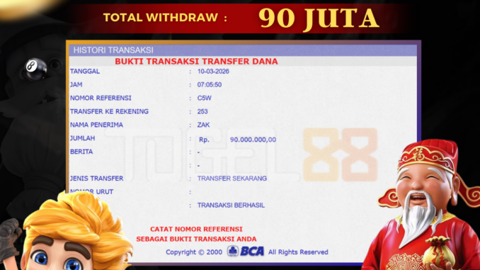 TOGEL88 mengucapkan selamat kepada user id : ZAK*** yang telah berhasil mendapatkan jackpot pada permainan ARCADE DI SPACEMAN. Kemenangan sebesar Rp 90.000.000,-. telah dibayarkan LUNAS oleh pihak TOGEL88 kepada pemilik user id setelah yang bersangkutan mengisi formulir withdraw. Proses pencairan dana berlangsung sangat cepat hanya dalam waktu 5-10 menit sudah berada dalam rekening pemilik user id. Bukti transfer yang dapat anda lihat adalah bukti SAH / VALID yang langsung di dapatkan melalui bukti transaksi dari Bank yang digunakan untuk pengiriman dana pada rekening pemilik user id. Terima kasih kami sampaikan kepada para pengguna setia TOGEL88 yang telah menggunakan situs kami, sebagai Bandar Terpercaya yang pastinya membayar semua kemenangan member hingga lunas. Apakah TOGEL88 PENIPU ? Reputasi “TOGEL88 TERPERCAYA” sudah sangat melekat. puluhan hingga ratusan ribu pengguna setia TOGEL88 tetap menggunakan situs terbesar dan terbaik di Indonesia ini. Hapus rasa was-was dan khawatir anda, kemenangan anda berapapun PASTI dibayarkan hingga lunas.