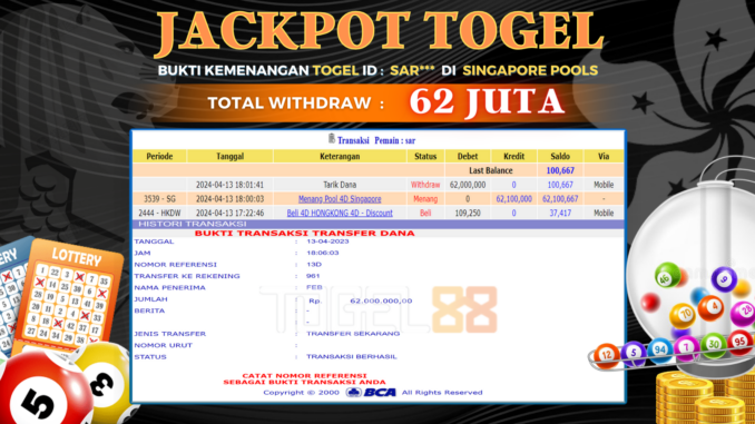 TOGEL88 mengucapkan selamat kepada user id : SAR*** yang telah berhasil mendapatkan jackpot pada permainan TOGEL DI SINGAPORE POOLS. Kemenangan sebesar Rp 62.000.000,-. telah dibayarkan LUNAS oleh pihak TOGEL88 kepada pemilik user id setelah yang bersangkutan mengisi formulir withdraw. Proses pencairan dana berlangsung sangat cepat hanya dalam waktu 5-10 menit sudah berada dalam rekening pemilik user id. Bukti transfer yang dapat anda lihat adalah bukti SAH / VALID yang langsung di dapatkan melalui bukti transaksi dari Bank yang digunakan untuk pengiriman dana pada rekening pemilik user id. Terima kasih kami sampaikan kepada para pengguna setia TOGEL88 yang telah menggunakan situs kami, sebagai Bandar Terpercaya yang pastinya membayar semua kemenangan member hingga lunas. Apakah TOGEL88 PENIPU ? Reputasi “TOGEL88 TERPERCAYA” sudah sangat melekat. puluhan hingga ratusan ribu pengguna setia TOGEL88 tetap menggunakan situs terbesar dan terbaik di Indonesia ini. Hapus rasa was-was dan khawatir anda, kemenangan anda berapapun PASTI dibayarkan hingga lunas.