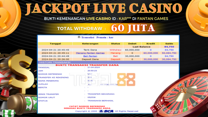TOGEL88 JACKPOT LIVE CASINO DI FANTAN GAMES Rp 60.000.000,- LUNAS