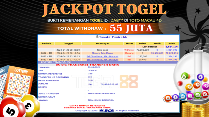 TOGEL88 JACKPOT TOGEL DI TOTO MACAU 4D Rp 55.000.000,- LUNAS