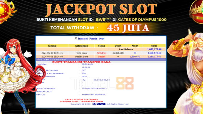 TOGEL88 mengucapkan selamat kepada user id : BWE*** yang telah berhasil mendapatkan jackpot pada permainan SLOT DI GATES OF OLYMPUS. Kemenangan sebesar Rp 45.000.000,-. telah dibayarkan LUNAS oleh pihak TOGEL88 kepada pemilik user id setelah yang bersangkutan mengisi formulir withdraw. Proses pencairan dana berlangsung sangat cepat hanya dalam waktu 5-10 menit sudah berada dalam rekening pemilik user id. Bukti transfer yang dapat anda lihat adalah bukti SAH / VALID yang langsung di dapatkan melalui bukti transaksi dari Bank yang digunakan untuk pengiriman dana pada rekening pemilik user id. Terima kasih kami sampaikan kepada para pengguna setia TOGEL88 yang telah menggunakan situs kami, sebagai Bandar Terpercaya yang pastinya membayar semua kemenangan member hingga lunas. Apakah TOGEL88 PENIPU ? Reputasi “TOGEL88 TERPERCAYA” sudah sangat melekat. puluhan hingga ratusan ribu pengguna setia TOGEL88 tetap menggunakan situs terbesar dan terbaik di Indonesia ini. Hapus rasa was-was dan khawatir anda, kemenangan anda berapapun PASTI dibayarkan hingga lunas.