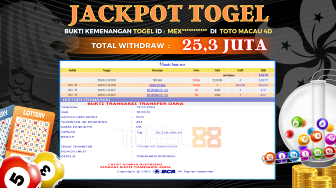TOGEL88 mengucapkan selamat kepada user id : MEX*** yang telah berhasil mendapatkan jackpot pada permainan TOGEL DI TOTO MACAU 4D. Kemenangan sebesar Rp 25.300.000,-. telah dibayarkan LUNAS oleh pihak TOGEL88 kepada pemilik user id setelah yang bersangkutan mengisi formulir withdraw. Proses pencairan dana berlangsung sangat cepat hanya dalam waktu 5-10 menit sudah berada dalam rekening pemilik user id. Bukti transfer yang dapat anda lihat adalah bukti SAH / VALID yang langsung di dapatkan melalui bukti transaksi dari Bank yang digunakan untuk pengiriman dana pada rekening pemilik user id. Terima kasih kami sampaikan kepada para pengguna setia TOGEL88 yang telah menggunakan situs kami, sebagai Bandar Terpercaya yang pastinya membayar semua kemenangan member hingga lunas. Apakah TOGEL88 PENIPU ? Reputasi “TOGEL88 TERPERCAYA” sudah sangat melekat. puluhan hingga ratusan ribu pengguna setia TOGEL88 tetap menggunakan situs terbesar dan terbaik di Indonesia ini. Hapus rasa was-was dan khawatir anda, kemenangan anda berapapun PASTI dibayarkan hingga lunas.