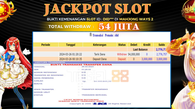 MEMBER TOGEL88 MENERIMA PELUNASAN KEMENANGAN JACKPOT SLOT DI MAHJONG WAYS 2 Rp 54.000.000,- LUNAS