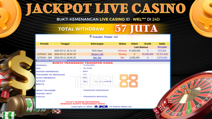 TOGEL88 JACKPOT LIVE CASINO DI 24D Rp 57.000.000,- LUNAS