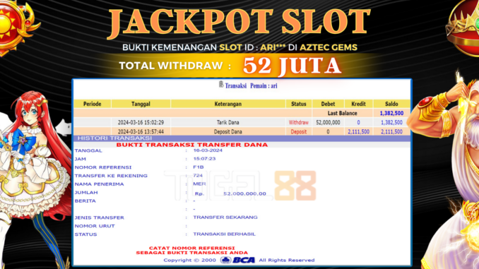 TOGEL88 mengucapkan selamat kepada user id : IND*** yang telah berhasil mendapatkan jackpot pada permainan SLOT DI SLOT SWEET BONANZA XMAS. Kemenangan sebesar Rp 41.100.000,-. telah dibayarkan LUNAS oleh pihak TOGEL88 kepada pemilik user id setelah yang bersangkutan mengisi formulir withdraw. Proses pencairan dana berlangsung sangat cepat hanya dalam waktu 5-10 menit sudah berada dalam rekening pemilik user id. Bukti transfer yang dapat anda lihat adalah bukti SAH / VALID yang langsung di dapatkan melalui bukti transaksi dari Bank yang digunakan untuk pengiriman dana pada rekening pemilik user id. Terima kasih kami sampaikan kepada para pengguna setia TOGEL88 yang telah menggunakan situs kami, sebagai Bandar Terpercaya yang pastinya membayar semua kemenangan member hingga lunas. Apakah TOGEL88 PENIPU ? Reputasi “TOGEL88 TERPERCAYA” sudah sangat melekat. puluhan hingga ratusan ribu pengguna setia TOGEL88 tetap menggunakan situs terbesar dan terbaik di Indonesia ini. Hapus rasa was-was dan khawatir anda, kemenangan anda berapapun PASTI dibayarkan hingga lunas.