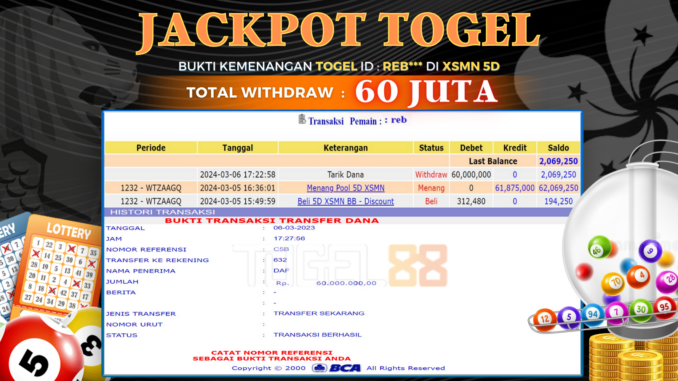 TOGEL88 mengucapkan selamat kepada user id : REB*** yang telah berhasil mendapatkan jackpot pada permainan TOGEL DI XSMN 5D. Kemenangan sebesar Rp 60.000.000,-. telah dibayarkan LUNAS oleh pihak TOGEL88 kepada pemilik user id setelah yang bersangkutan mengisi formulir withdraw. Proses pencairan dana berlangsung sangat cepat hanya dalam waktu 5-10 menit sudah berada dalam rekening pemilik user id. Bukti transfer yang dapat anda lihat adalah bukti SAH / VALID yang langsung di dapatkan melalui bukti transaksi dari Bank yang digunakan untuk pengiriman dana pada rekening pemilik user id. Terima kasih kami sampaikan kepada para pengguna setia TOGEL88 yang telah menggunakan situs kami, sebagai Bandar Terpercaya yang pastinya membayar semua kemenangan member hingga lunas. Apakah TOGEL88 PENIPU ? Reputasi “TOGEL88 TERPERCAYA” sudah sangat melekat. puluhan hingga ratusan ribu pengguna setia TOGEL88 tetap menggunakan situs terbesar dan terbaik di Indonesia ini. Hapus rasa was-was dan khawatir anda, kemenangan anda berapapun PASTI dibayarkan hingga lunas.