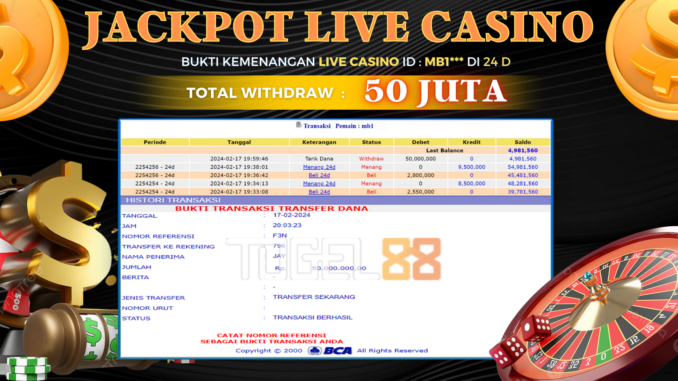 MEMBER TOGEL88 MENERIMA PELUNASAN KEMENANGAN JACKPOT LIVE CASINO DI 24D Rp 50.000.000,- LUNAS